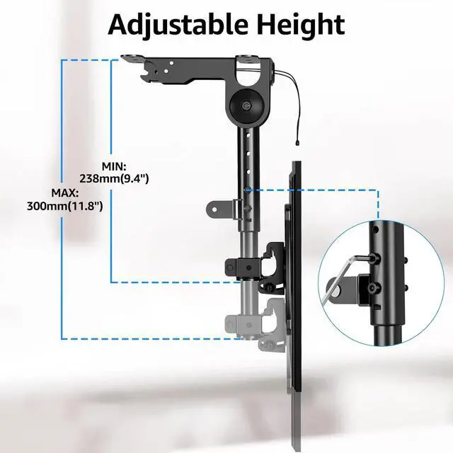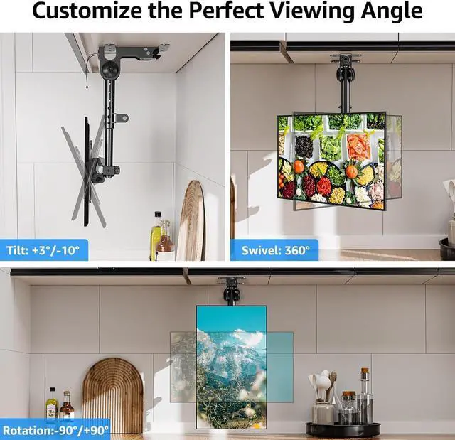 Viewing Experience: This full motion under cabinet TV mount features multi-angle adjustment 360° swivel 238-200 mm/ 9.4 - 11.8 inches height adjustable rotating +90°/-90° tilting angle of +3°/-10°. You can customize the perfect viewing angle by adjusting the angle according to your viewing spaceEasy