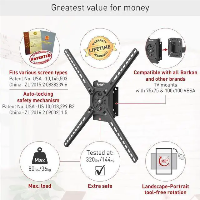 VERSATILITY: The mount can be connected to any other mount (non-Barkan as well) that has 75X75 or 100X100 VESA connection hole? PATENTED AUTO LOCKING MECHANISM - This TV mount includes a US & China approved patent of Auto Locking Mechanism to prevent the disengagement of the screen from the wall unlike other screw locking mechanisms that are usually not performed. In the Auto lock mechanism there aren't any cords or springs that might break and it includes 2 hanging points on each side instead of the single hanging point in most locking mechanisms.? WORLD KNOWN BRAND - Since its foundation in 1988 Barkan Mounts has been working to enhance the viewing experience of the customer. Our expertise is in the development manufacturing and marketing of designed and innovative TV Mounts. Our customer service experts are available every day of the week and are ready to help! Visit our website to find more information any kind of help manuals FAQ and more.