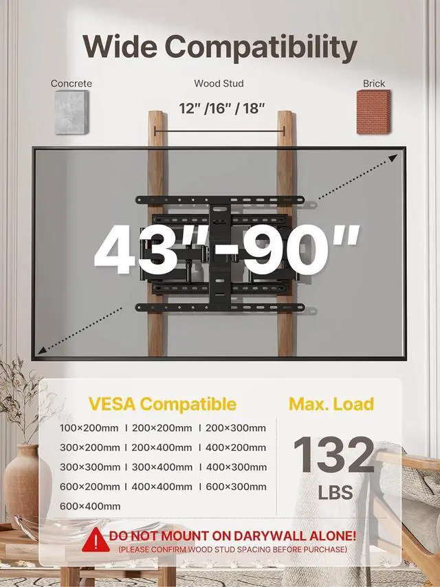 TV WALL MOUNT COMPATIBLITY: This Ultra slim TV wall mount fits for most of 43-90 inch LCD/LED/OLED TVs with VESA patterns 100x200 mm up to 600x400 mm and up to 132 lbs. Designed for installation on 16/18 wood studs concrete and brick walls. (Do not install the mount on drywall alone! ) Perfect for TV installation in living room kitchen bedroom office or any other placeULTRA