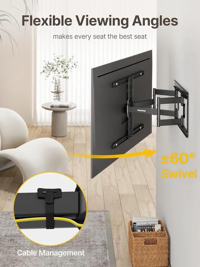 SLIM & DISCREET DESIGN: This thin tv wall mount has been cleverly designed to retract to a mere 1.1 inches from the wall ensuring a super slim profile that merges flawlessly with your living space. Its design leaves ample room for your creative home décor and with a velcro for cable management all your cables are neatly organized and hidden enhancing the neatness and elegance of your spaceCOMFORTABLE