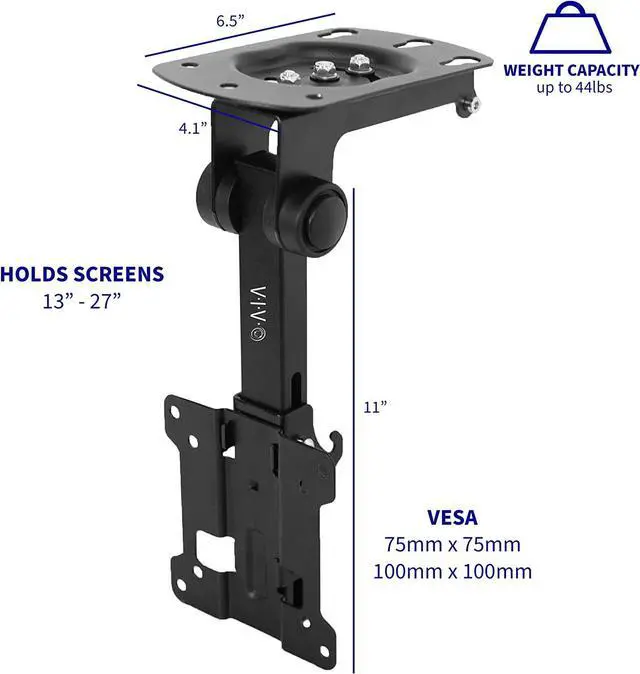 Compatibility - Fits Screens up to 13 - 27 screens with 75x75mm or 100x100mm mounting capability. Mounts to ceilings cabinets (61cm deep cabinets only) upper desk shelving and more.