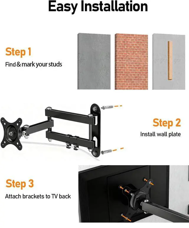 TV Mount Compatibility: This full motion TV mount suitable for TVs with VESA standard mounting holes 75x75mm and 100x100mm. Fit 13-32 inch TV (many people used for 32 26 24 18 17 inch TVs & monitors) compatible with LG Sony TCL Vizio Sharp Panasonic Toshiba JVC AOC ViewSonic and all brands as long as VESA compatible. It can be mounted single wood studs and concrete/brick wallsFull Motion for