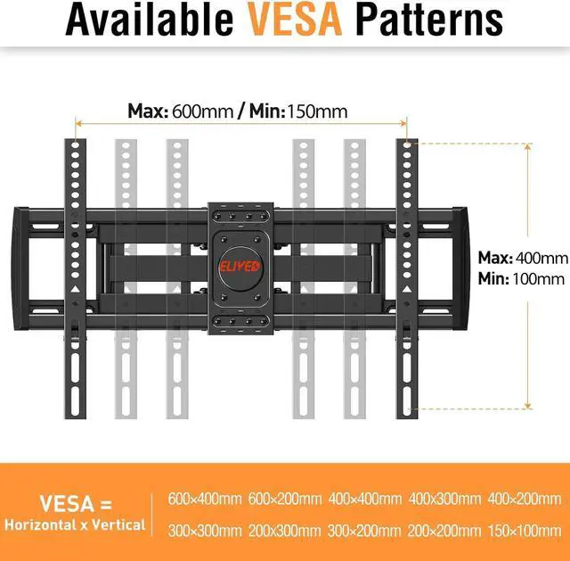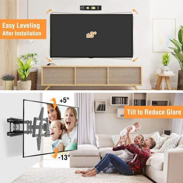 Universal Compatibility - This TV wall bracket fits most 37-75 inch LED/LCD/OLED/Plasma flat-screen curved TVs compatible with VESA patterns from 150x100mm to 600x400mm holds up to 99 lbs. /45 kg. Please confirm TV VESA TV weight and input access before purchaseEasy for TV Centering - Large wall TV mount fits 16 18 24 wood studs spacing which is convenient to help center your TV even when the studs are off centerFlexible Movement - Swivel TV wall mount is able to tilt TV +5°/-13° to reduce screen glare swivel +/-45° to cover different viewing angles and level +/-3° after installation.