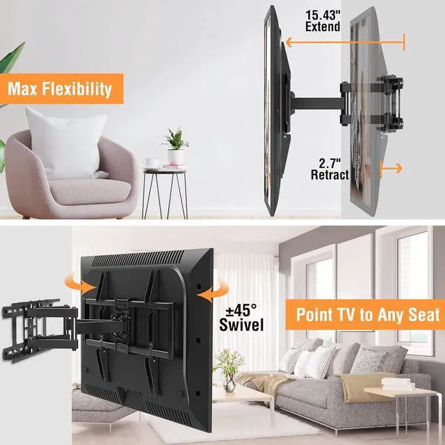With the strong articulating arms you can pulll it out 15.7 and retracts back 2.46 to save space and keep your house neatFast Installation - TV mounting bracket comes with necessary hardware kit for wood studs or concrete/brick wall. (Concrete anchors are not included and will be sent per request). The step-by-step manual will guide you to complete the installation quickly. Do not mount into drywall aloneHassle-Free - Come with cable ties for clean cable management. Ideal TV bracket for home office hotel gym cinema shopping mall and more