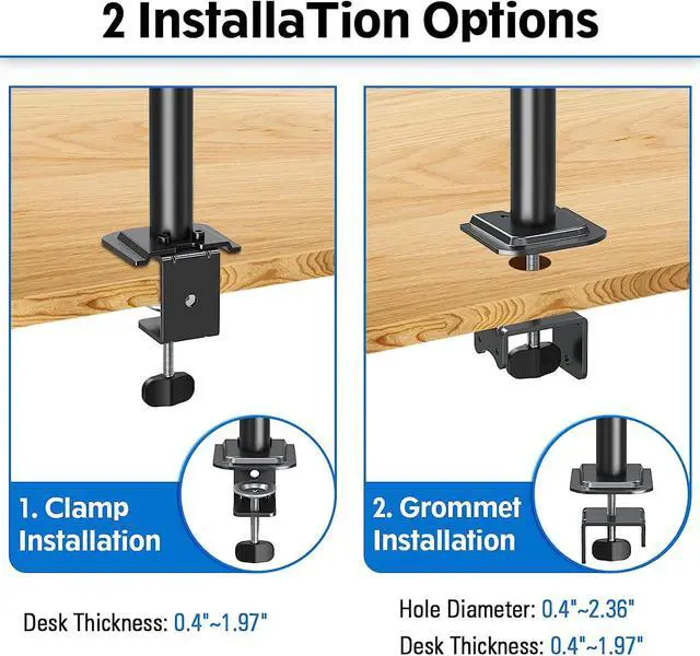 Easy Installation & Two Mount Options - The detachable VESA plate makes it simple to attach your monitor. Support c-clamp (drill-free) and grommet (optional) installation. Suitable for most tables with a thickness of 0.4" - 1.97" or a hole diameter of 0.4" - 2.36". The Bigger C-clamp is available on request which is suitable for the desk thickness over 1.97 ''.