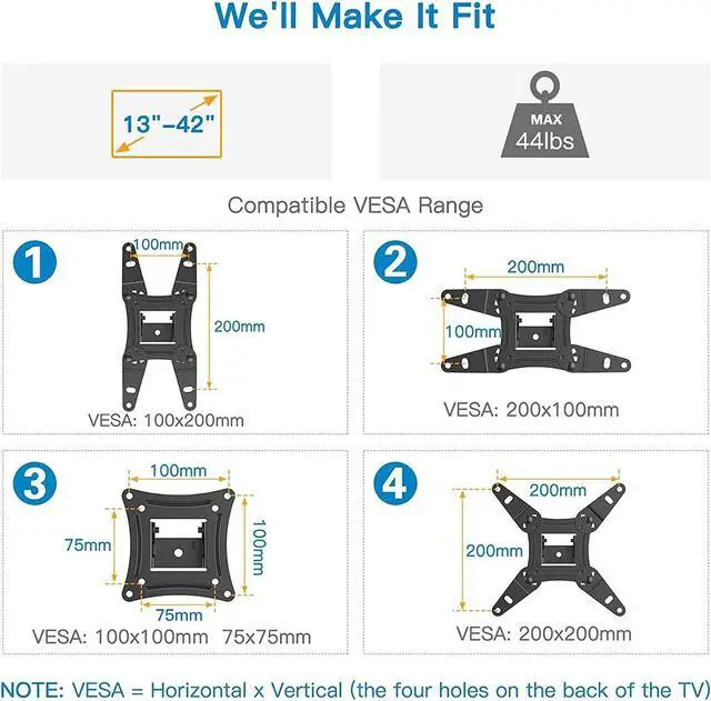 TV Mount Compatibility - TVs wall mount fits SAMSUNG, SONY, LG, VIZIO, TCL, ELEMENT, SCEPTRE, HISENSE and other TV brands between 13 and 42 Inch screen sizes and up to 44 lbs, with max VESA/mounting holes spacing of 200 x 200mm. our Images and video will help you see if this TV/ monitor mount perfectly fits your device in the aspects: VESA, stud location and possible blocked inputs.