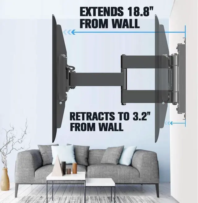 TV Mount Swivel and Tilt: TV mount can tilt TV 5° up and 15° down to reduce glare, swivel the TV left or right 45°. Extending 18.8 and retract back to 3.2, making your TV alive to move. +/-3° post-installation adjustment allows for perfect TV leveling.