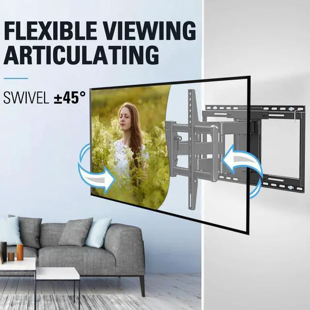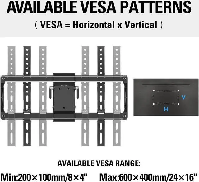 Universal TV Mount: Full Motion TV Mount for most 42-86" TVs up to 132 lbs. with MAX VESA 600mm x 400mm and 16-24 inch wood studs spacing. Please check the TV VESA and TV weight, compatible wall types and possible blocked input before purchasing.