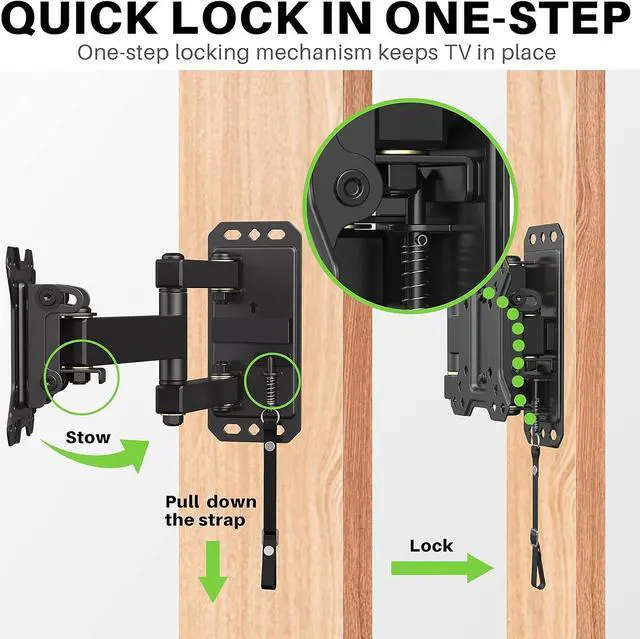 UNIQUE ONE STEP LOCK MECHANISM: RV mount with unique locking mechanism with 20mm tongue secures and then fixed swivel arms and TV plate at that time when the vehicle is in motion to prevent any bumps. One-step safety locking system helps you better release and lock the TV in place securely with the pulling strap. Spring latch of RV TV mount can help use more easy on Locking mechanism and stop creaking on your trip.