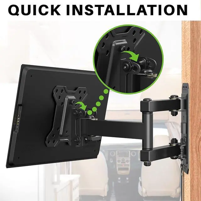 HEAVY DUTY TV MOUNT: RV full motion TV mount fits for most 10-26 inch TVs up to 33 lbs., with VESA/mounting holes spacing from 50x50mm to 100x100mm,. Please check you TV VESA size, TV weight before order. This mount was made in highly steel makes whole unit sturdy and safe.