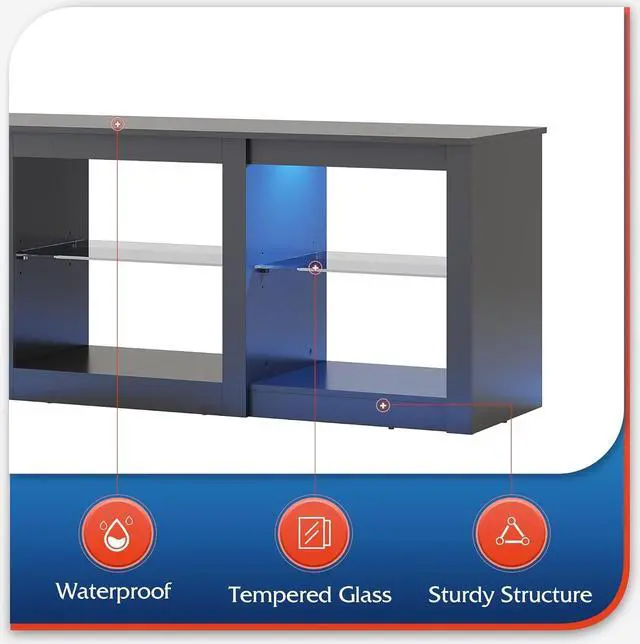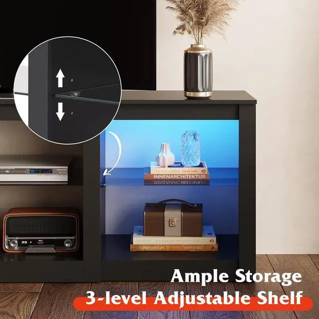 • Ample StorageThree adjustable tempered glass shelves can be adjusted to fit the height of the item, the open storage space gives enough room to put down your DVDs, game consoles, stereos and decorative items.