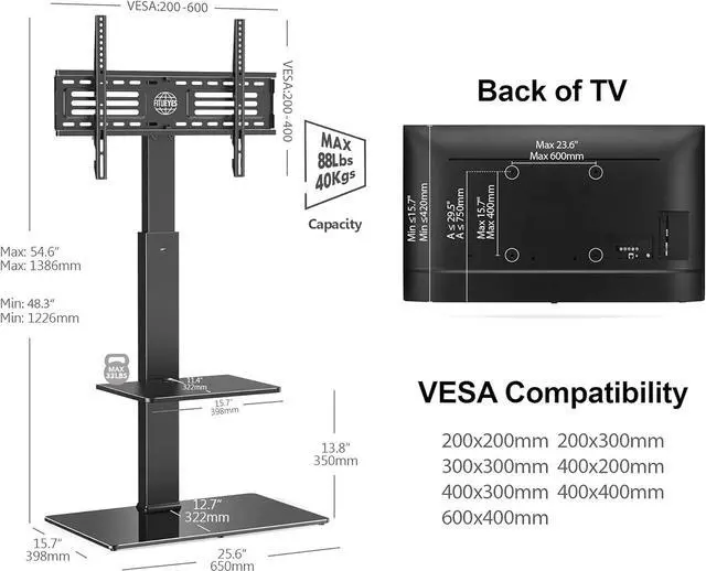 TV FLOOR STAND FOR 75 INCH TV - The floor tv stand fits most 32 37 40 43 46 50 55 60 65 75 inch TVs, Make sure your VESA (mounting hole pattern) falls between: 200 (w) x200 (h) -600 (w) x400 (h) mm.