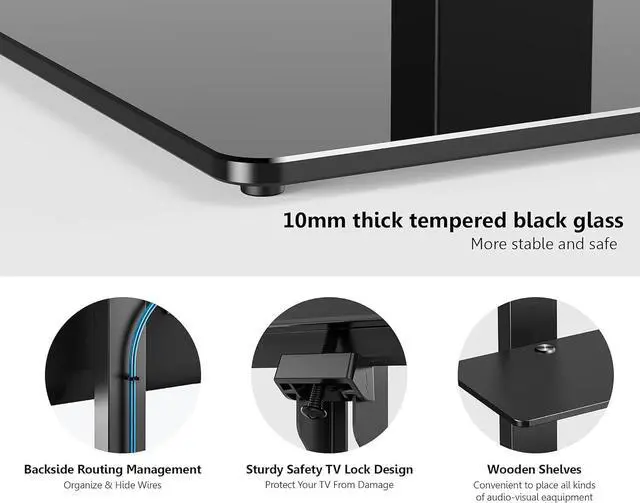 SPACE SAVING & CABLE MANAGEMENT- No drilling on your wall, but a stable tall TV stand with mount to hold your TV. Tempered Glass Base and MDF shelf to hold your essential A/V components, cable box, DVD player or gaming systems. Cable clips at the back of this black TV stand are a big bonus. Keep your wires and accessories organized and neat