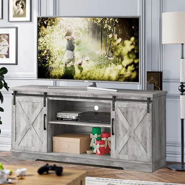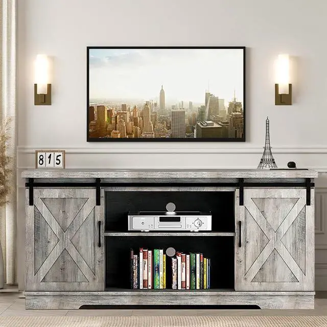 FARMHOUSE CLASSIC DESIGN: This beautiful barn door TV stand with a grey wood grain finish adds a rustic appeal to your living room or entertainment space. With modern and traditional farmhouse style, our large entertainment center for 65-inch TV is suitable for all decor styles. You can keep movies, games, and entertainment devices hidden behind the barn doors or show them in the open compartments, it can also serve as a storage cabinet to show your photos and potted plants.
