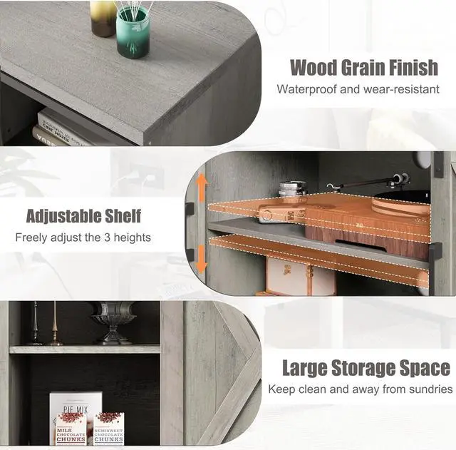 * CHIC ENTERTAINMENT CENTER: This barn door TV stand is designed with two metal handles, the sliding cabinet door is more smooth, it is easy to access items, and no noise during movement. The shelves of this modern console table can be adjusted in 3 heights, you can freely adjust the height according to the items you need to store. Designed with cable holes on the back of the entertainment center to store extra cables, this TV stand cleverly hides clutter, big or small.