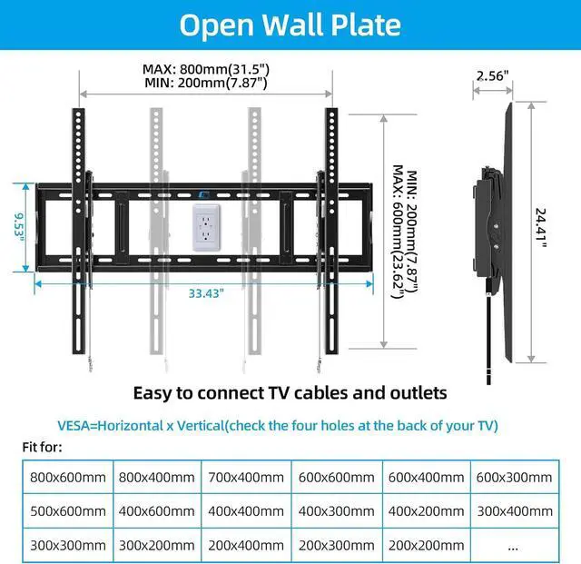 Utilizes Wall Space and Compatible with Outlets: The low profile TV mount' s enhanced tilt components allow a minimum distance of 2.56 inches from the wall, allowing installation on walls with electrical outlets (measurement of outlet and plug size required). Tilting the TV up 5° makes it easier to access the HDMI/USB ports on the side of the TV.