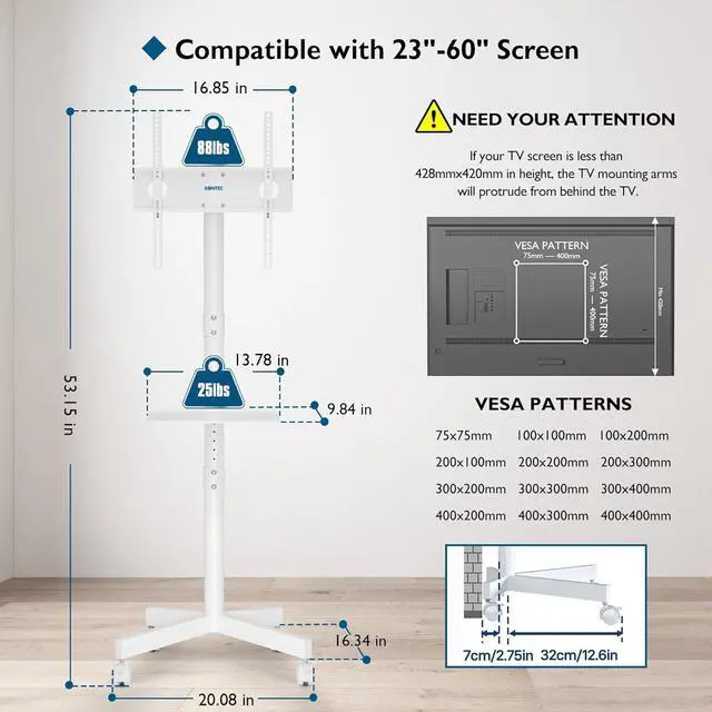 UNIVERSAL COMPATIBILITY Fits most 23-60 inch LCD/LED/OLED flat and curved screen TVs with VESA patterns up to 400x400mm, making this mobile TV stand ideal for a wide range of TV models.