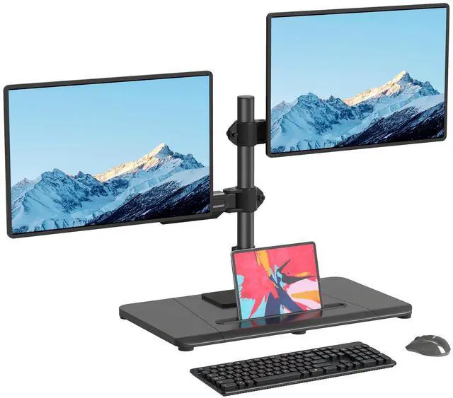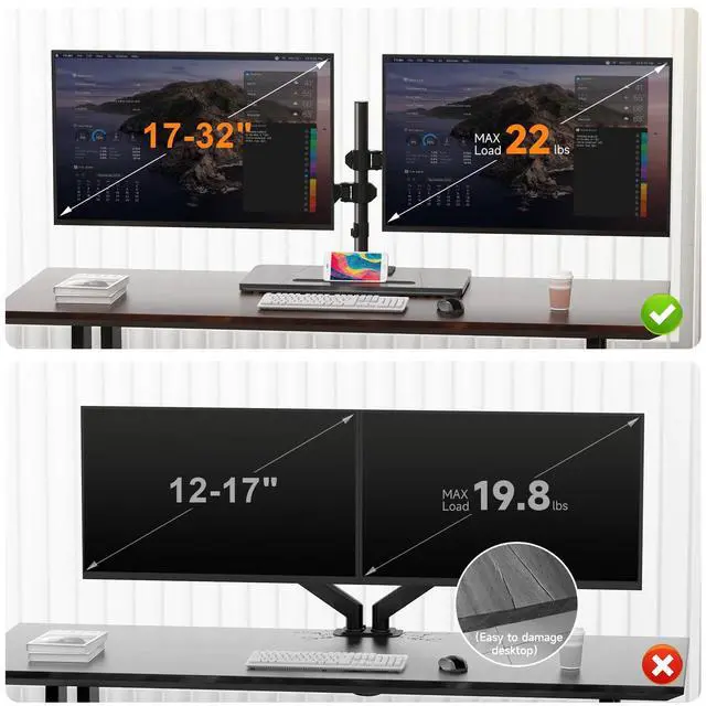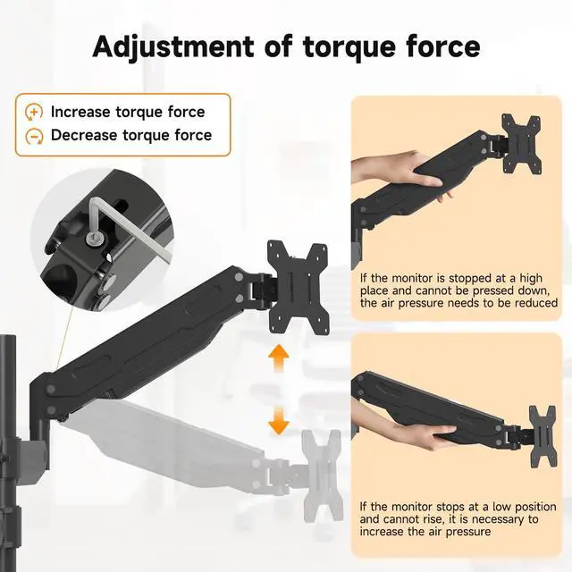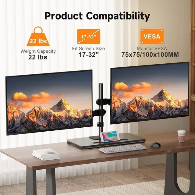 Transform your workspace with this versatile dual monitor mount designed for screens ranging from 17 to 32 inches. The gas spring arms provide smooth, effortless adjustments to help you find your ideal viewing position. Each arm moves independently, allowing you to tilt, swivel, and rotate your displays for optimal ergonomic comfort. The robust construction supports your monitors securely while freeing up valuable desk space. Perfect for both home offices and professional settings, this mount helps create an organized, efficient workspace. The gas spring mechanism maintains your chosen position without drooping, while making future adjustments quick and easy. Whether you're coding, designing, or managing multiple spreadsheets, this dual monitor stand enhances productivity by letting you arrange your screens exactly how you need them.