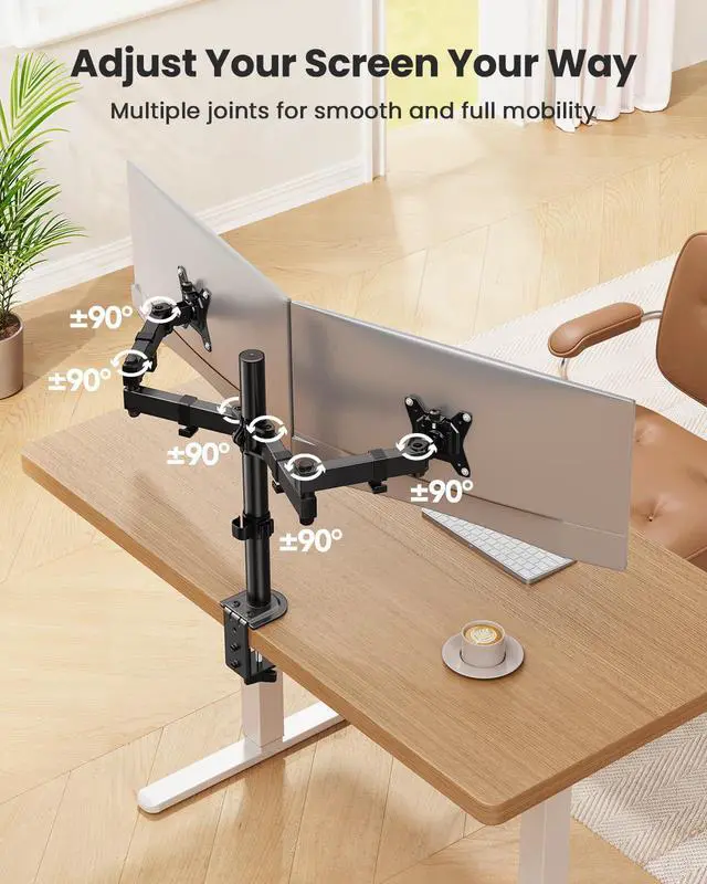 This fully adjustable dual monitor stand enables you adjust your monitors to the ideal position for better posture, reducing neck and back strain. Stay comfortable all day and maintain full focus on what matters.