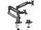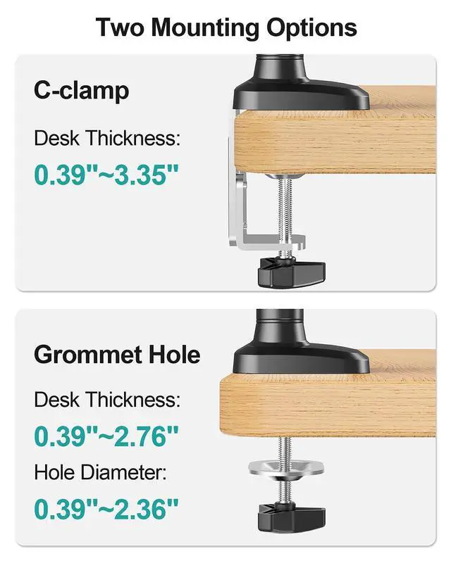 Product Specifications: 1. Material: Precision-grade plastic, steel, and aluminum alloy 2. Adjustable height range: 5.9" to 18.5"3. Tilt adjustment: +75° to -45°4. Swivel angle: ±90°5. Rotation adjustment: 360° 6. Maximum extension: 22" Compatibility Check: Before purchasing this dual monitor stand for desk,please verify the following specifications of your monitor: 1. Monitor size: 17" to 39"2. Monitor weight: 2.2 lbs to 26.5 lbs 3. VESA mounting holes (75x75mm or 100x100mm) must be present on the back of the monitor Additionally, confirm the thickness of your desk:- For C-clamp installation, the desktop thickness should be between 0.39" and 3.35". - For grommet installation, the desktop thickness should also be between 0.39" and 2.76". Main Features:Support for Large Monitors: This double monitor mount supports monitors up to 39" in size and weighing up to 26.5 lbs. It is compatible with most flat and curved computer screens ranging from 22" to 39", featuring VESA mounting holes of 75x75mm or 100x100mm. It can hold monitors weighing between 4.4 lbs and 26.5 lbs. . If your monitor does not have VESA holes, a VESA mount adapter may be required. Space Optimization: By utilizing this 2 monitor stand, you can significantly reduce clutter on your desktop and create an organized workspace. The integrated cable management system effectively addresses issues of tangled wires, ensuring a clean and professional appearance. Durability and Stability: Constructed with high-strength aluminum alloy and arms that are 30% thicker than standard models, this two monitor desk mount has successfully passed over 20,000 fatigue tests. This ensures long-term reliability and enhanced stability for various setups. Full-Motion Ergonomic Adjustability: 360° rotation for landscape or portrait orientation, swivels 180° to share your display, and +75°/-45° tilt for the ideal screen angle. Easily adjustable stand for optimal workspace organization and efficient use of desk space. It allows you to effortlessly find the ideal ergonomic posture to boost comfort and productivity when working or playing games, taking you to the next level! Effortless Installation - Equipped with clear manual and mounting hardware needed. You can choose drill-free c-clamp mounting (suitable for desks from 0.39 to 3.35" thick) or grommet mounting (suitable for desks from 0.39 to 2.76" thick)
