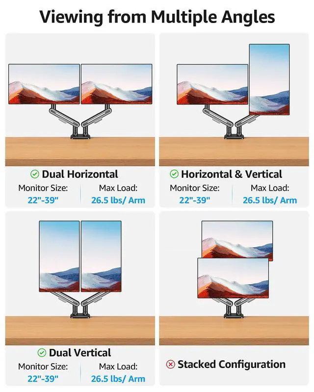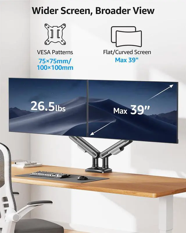 MOUNTUP dual monitor mounts have been upgraded to support monitors weighing up to 26.5 lbs per arm