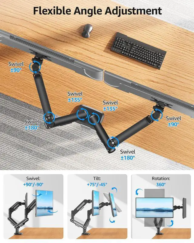 MOUNTUP dual monitor mount adopts an advanced ergonomic design concept, utilizing a multi-dimensional adjustable structure to comprehensively optimize the user's working posture