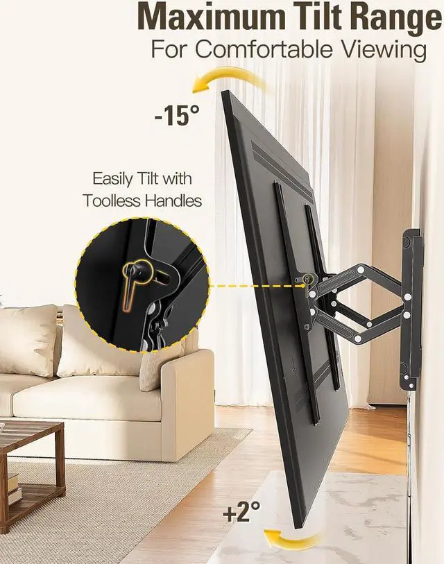 Advanced Full Tilt Extension: The advanced tilt TV mount extends TV up to 7 inch for the maximum tilting range and easy cable access. Retracts back to wall 2.68 inch for saving space. No tools are needed to tilt your TV to reduce glare, making your TV stay perfectly positioned for optimal viewing experience.