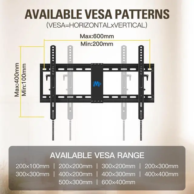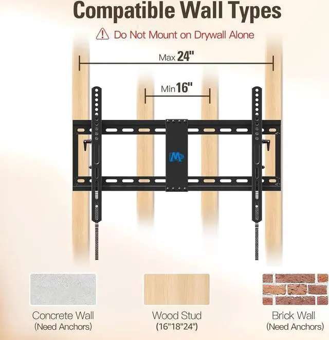 Universal Design TV Mount: Advanced tilt TV wall mount fits for most 42-90 inch TVs up to 120 lbs. with MAX VESA of 600mm x 400mm and 16", 18", 24" wood studs spacing. Please check the TV VESA, TV weight, compatible wall types (wood studs spacing or concrete wall) and possible blocked input before purchasing.