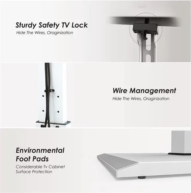 Comfortable and Convenient User ExperienceFor your comfortable user experience, the Universal Swivel TV Stand is designed with clean and efficient cable management and safety locks. This white tall TV stand can easily collect messy cables, which brings you comfort and tranquility. In addition, the sturdy safety lock on the portable TV stand will firmly protect your TV.