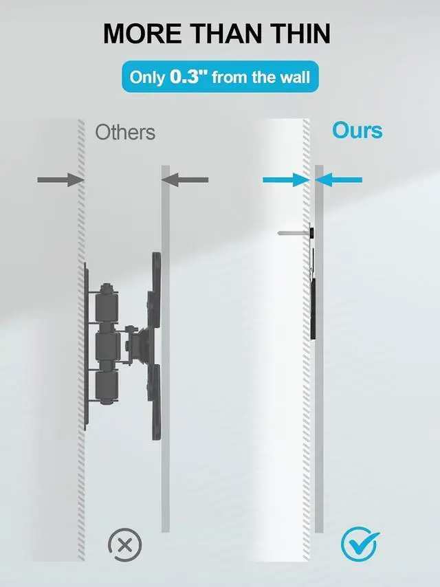 Slimmest Design: The slimmest low profile TV wall mount ( 0.3 " )70% thinner than standard mounts (1" ). Your TV sits almost flush, creating a picture-like display that blends into your space. No gaps, just minimalist elegance. (Only for TV with flat back, not for TV with uneven back or no holes),