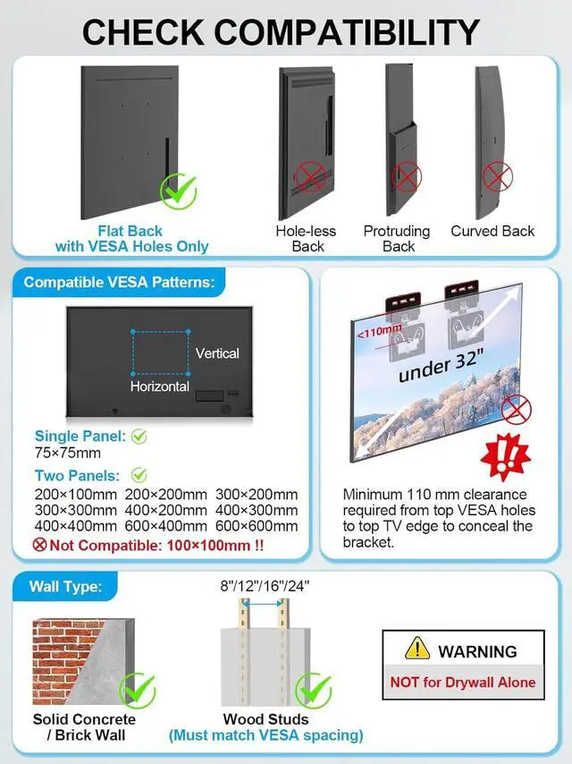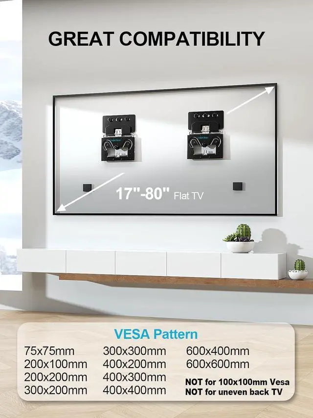 Wide Compatibility: Perfectly tailored for 14" " to 80" " 4K LED/LCE/OLED flat/frame TV, this mount supports single-wall panel installations with 75×75mm VESA and dual-wall panel setups from 200×100mm up to unlimited sizes. Widely compatible with TCL, Samsung, Sony, Panasonic, Toshiba, Sharp, LG, Philips, JVC, and more brands frame TV. (Not for 100x100mm VESA. )