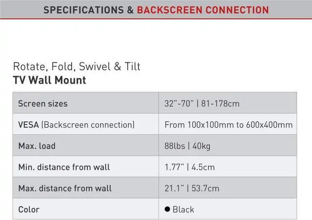 FUNCTIONALITY - The mount has 3 pivots which: rotate near the wall (double arm) 180°, fold 360°, swivel near the screen connection plate 180° in addition to a tool-free tilt from 0° till 10°. Allows a 90° swivel for TVs up to 50".