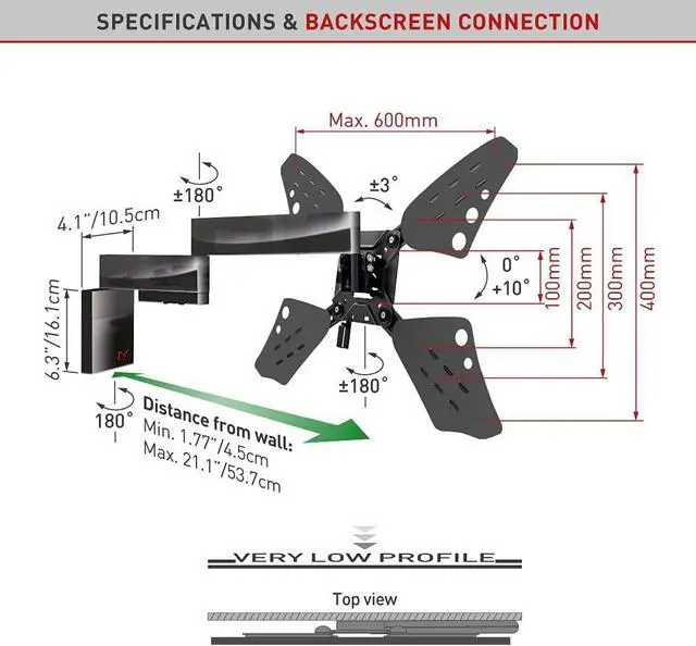 EXTREMELY EXTENDABLE - Minimum distance from the wall - 2.4 ", Maximum distance from the wall - 25.2 ". Allow viewing from a variety of places and locating the screen around the corner of a wall.