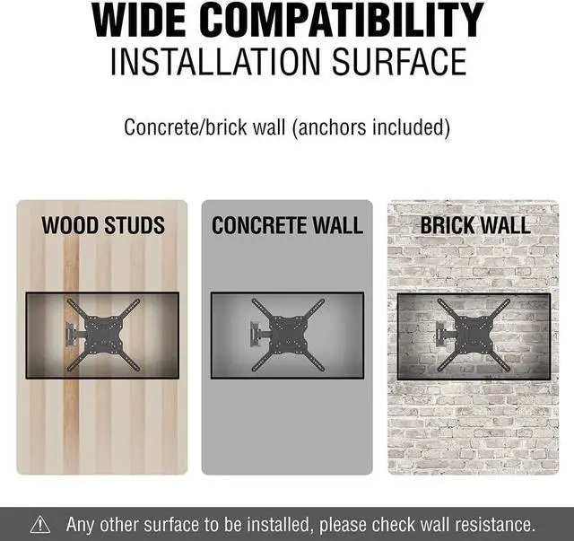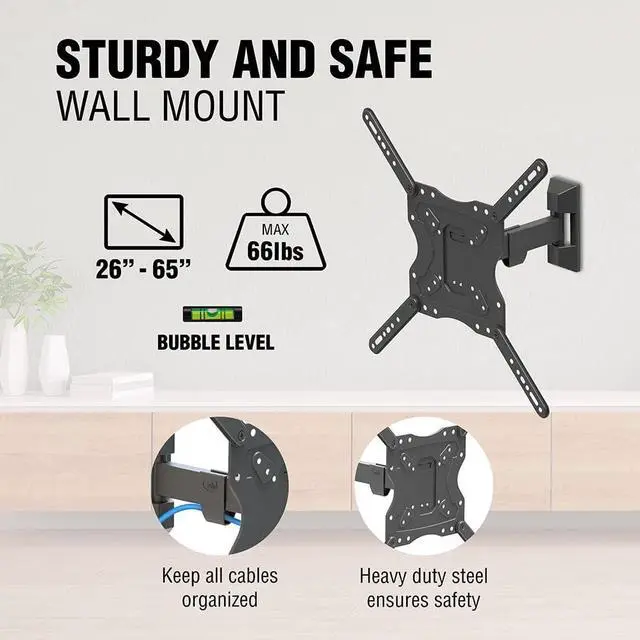 FULL MOTION TV WALL MOUNT DESIGNED FOR OVERSIZED TVs: This articulated TV wall mount is designed from 26" up to 65" TVs and is rated for TVs up to 66.1 lbs/30kg. It has a compatible faceplate that fits VESA size 2.9 x 2.9 in to 15.74 x 15.74 in (HxV). When retracted, this model has a unique slim profile design - your TV will look like a paint on the wall!