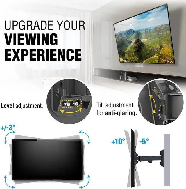 FULL MOTION FOR MULTI VIEWING EXPERIENCE: A perfect combination! This product has an articulating bracket that allows -5°/+10° tilt for anti-glaring, extends up to 16.3 " and retracts back to 2.87 " for flexible movement and space-savings, moves max swivels 90° display left or right according to your more enjoyable viewing (note: max. swivel angle depends on screen size) and rolls -3°/+3° post installation (adjustment) for perfect TV leveling.