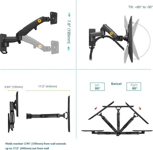 Monitor Lift range 7.6 ' ' (195mm), Min distance from wall only 3.94 ' ' (100mm) and max extension up to 17.5 ' ' (445mm) Enhance your viewing and gaming experience.