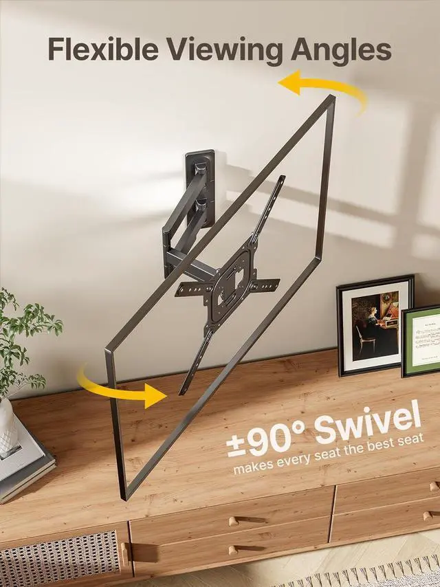 PERFECT VIEWING ANGLE: The swivel tv wall mount can tilt +5°/-10° to reduce glare and swivels +/-90° to provide full-motion adjustment capacity for ideal viewing. Extends up 17 to get more comforts from any seat in the room. Level the TV +/-3° after installation to perfectly fine tune the