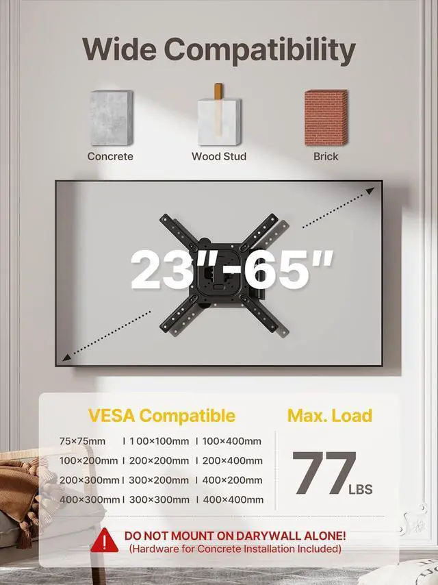 TV WALL MOUNT COMPATIBLITY: This full motion tv wall mount fits for most of 23-65inch flat curved screen TVs and mointor with VESA patterns 75x75mm up to 400x400mm and up to 77lbs. Compatible with wood stud, concrete, and brick wall mounting. Do not install the tv mount on drywall alone. perfect center design