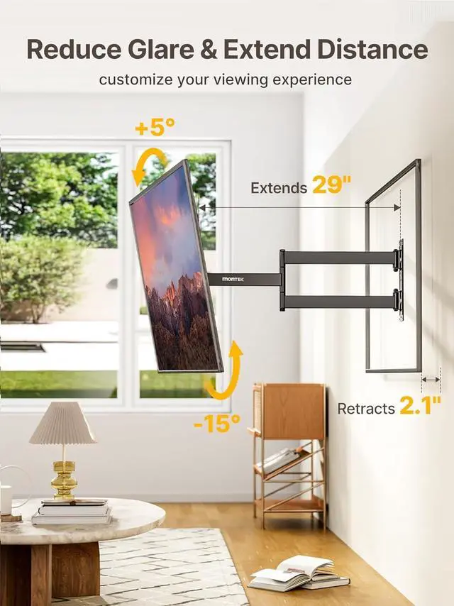 LONG EXTENSION TV MOUNT: This extra long extension TV wall mount can extend 29 from wall for optimal viewing from various positions. When you need to save space without compromising aesthetics, it elegantly retracts to just 2.1 ". Its unique extra-long arm design is particularly suited for corner placement, allowing TV viewing from any spot in your room
