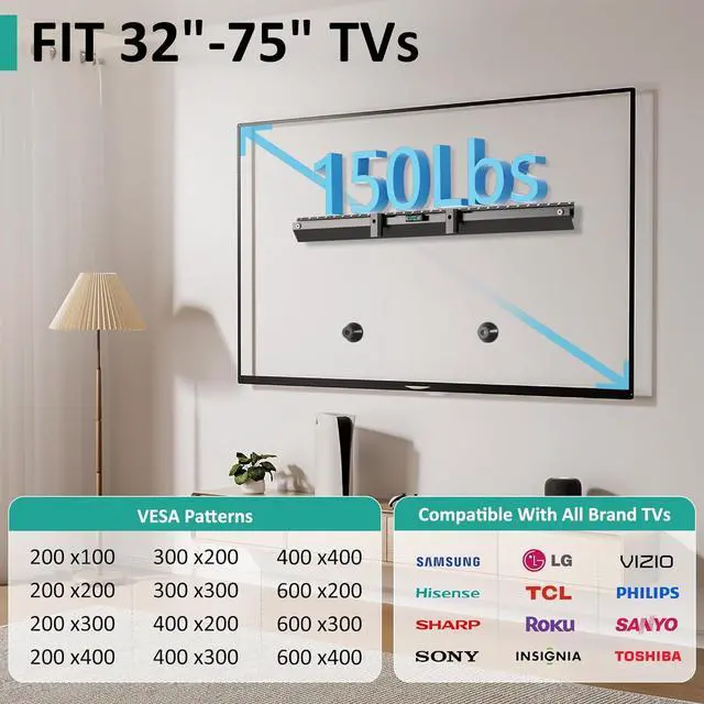 Fits 32-75 TVsArtressel studless TV wall mount fits most 3275 inch flat screen TVs, including LG, Samsung, Sony, and more. Mount your TV in minutes without studs or toolsan easy pick for renters wanting a clean setup without wall marks