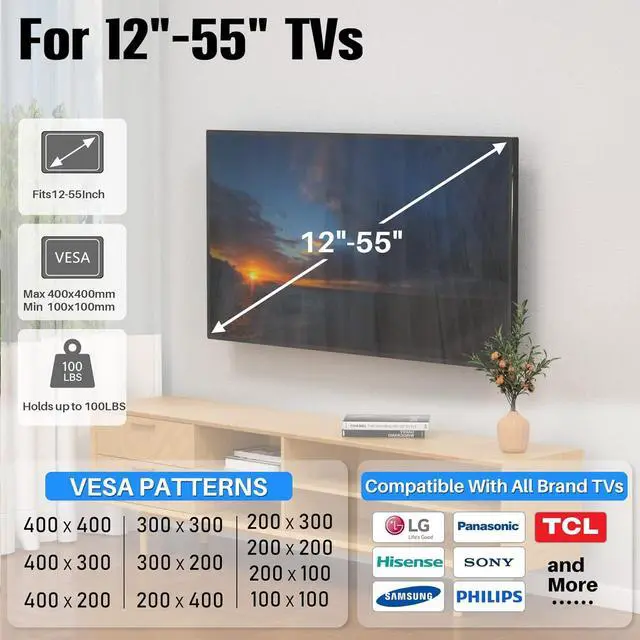 Universal TV MountTV Drywall Mounting fit most 12-55 inch TVs from popular brands like LG, Sony, Vizio, Panasonic, Toshiba, Sharp, and Philips, and supports VESA patterns ranging from 100x100mm to 400x400mm, The perfect choice for a hassle-free installation.