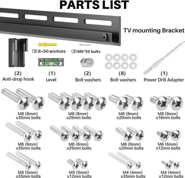 Fast and Easy InstallationThe studless TV wall mount includes all necessary mounting hardware and an easy-to-understand English installation guide, making installation a breeze. With our easy-to-follow instructions and simple installation process, you can have your TV set up in just 10 minutes.