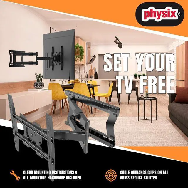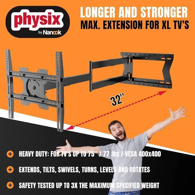 Physix 2080 Long Arm TV Wall Mount for 32-75'' Screens, Extension 32'', Heavy-Duty Max 88 lbs - Full Motion, Tilting & Swiveling, Max VESA 400x400