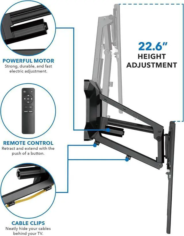 PROGRAMMABLE REMOTE CONTROL: With the programmable remote control, this mount offers the pinnacle of convenience for those lazy days or when hosting. Adjust your TVs height and angle with ease, making it the perfect companion for your living room. Its the epitome of remote TV mount technology, designed for effortless living.