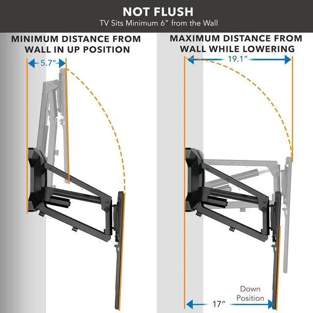 HEAVY-DUTY MOTOR: Engineered with a heavy-duty, yet silent motor, this motorized TV mount with remote raises and lowers TVs up to 77 lbs (safety tested to 154 lbs), ensuring your viewing experience is smooth and uninterrupted. It embodies the essence of a pull-down TV mount over fireplace, transforming your space into a dynamic viewing haven.