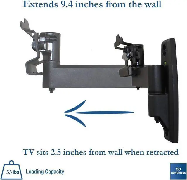 EXTENDS 2.5 - 9.4 FROM WALL - Sitting just 2.5 inches from the wall it offers a very low profile for your TV but leaves enough room behind the TV to tilt it to the degree you desire, and also store the wiring without the fear of damaging wires or the TV itself. You can also extend the TV out as far as 9.4 inches.