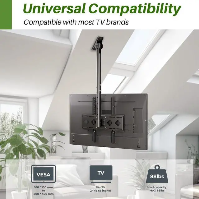Heavy Duty Ceiling TV Mount for 24-65": The AENTGIU ceiling mount tv bracket fits most 24- 65 inch TVs with VESA patterns 400x400 to 100x100mm. Plus, hanging tv mount from ceiling can hold up to 88 lbs, providing reliable support for your valuable TV