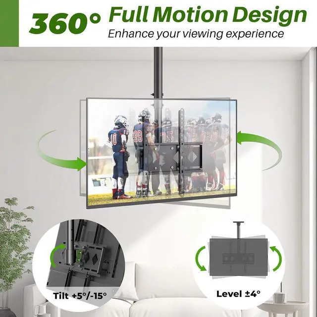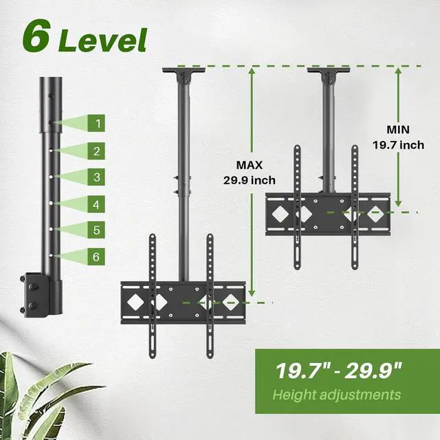 Enhance Your Ideal Viewing: Enjoy optimal viewing angles with the hanging tv mount. It offers ±4°screen level adjustment, +5°/-15°tilt to reduce glare, and a 360°swivel feature, 6 adjustable heights varying from 19.5 " to 29.5 " for the comfortable view. Ieally at eye level when seated