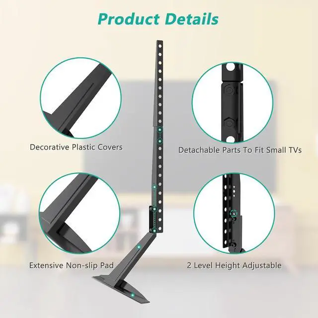 -: Table top tv stand provides 2 level height adjustable mounting holes for better-viewing flexibility. With enough space between the bracket feet for furniture