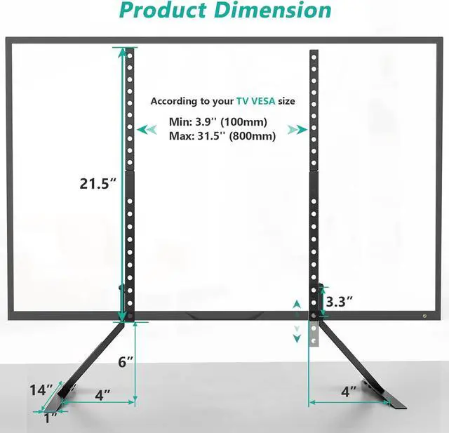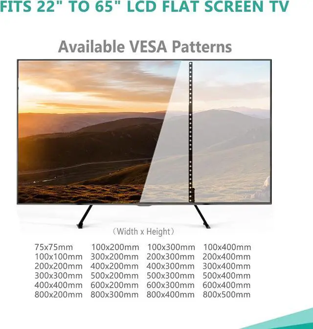 : WALI TV stands holds 22" - 65" TVs and holds up to 110 lbs. Mounting Holes from 75x75mm up to 800x500mm. This tv legs can easily hold your TV on your table with safety and stability
